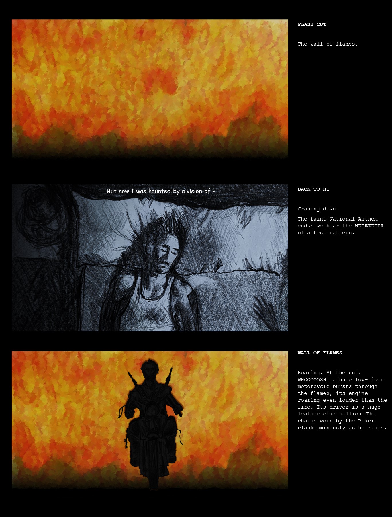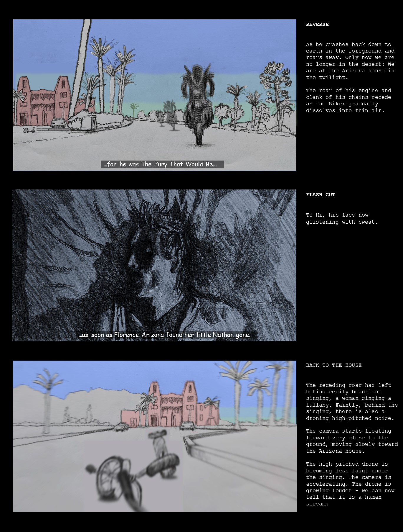 In the later frames, I used an on-line ‘zoom blur’ tool to indicate the rushing forward camera motion.