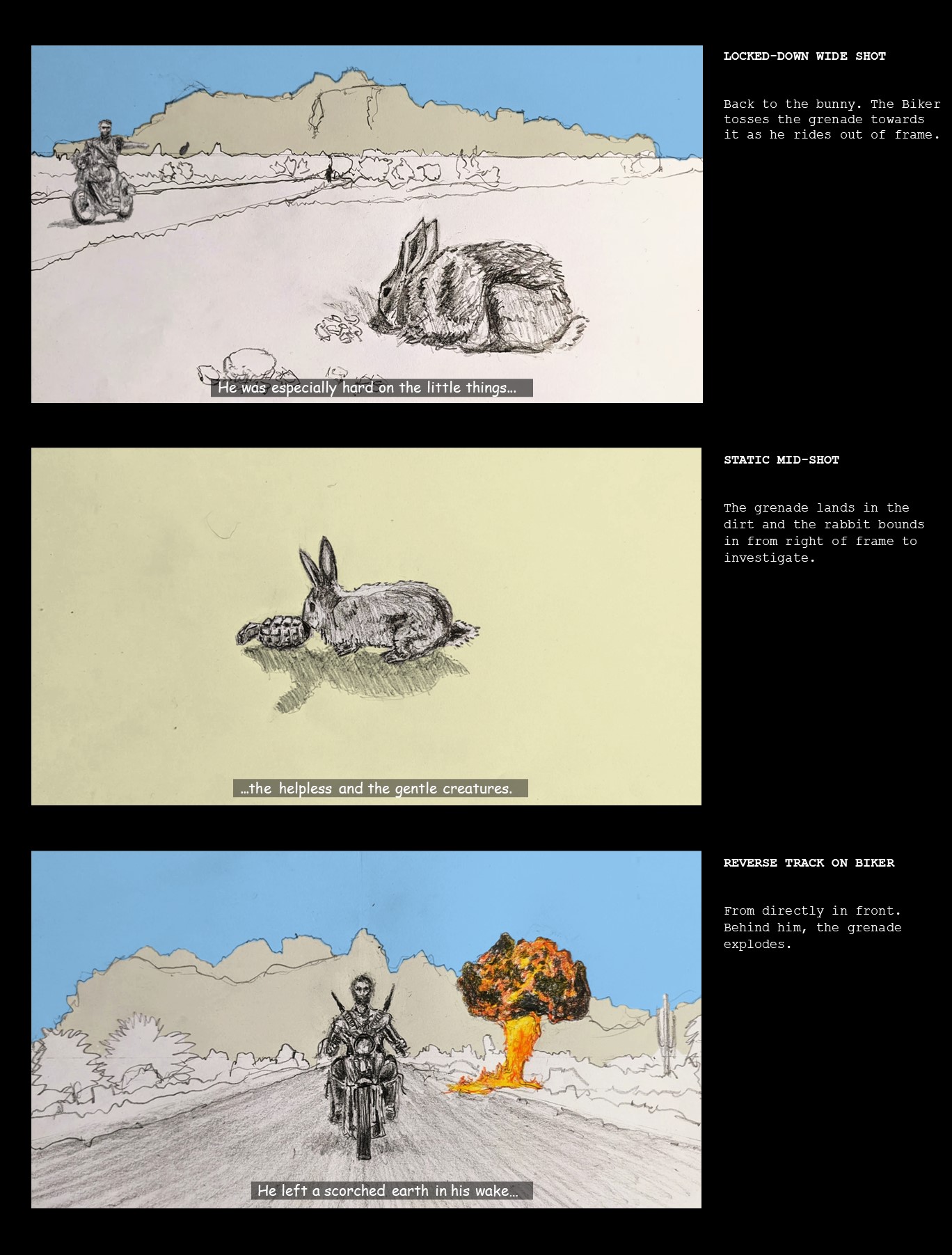 When I googled the script for this, I found a version that included scene descriptions and camera positions and movements, which I have included to the right of each cell. There were some variations between what was in the script and what ended up in the final edit (for instance in the script, the rabbit was dispatched with a shotgun and not a hand grenade) – so I had to tweak the descriptions to match. I did toy with the idea of producing a storyboard that illustrated the script and not the final film but … didn’t.