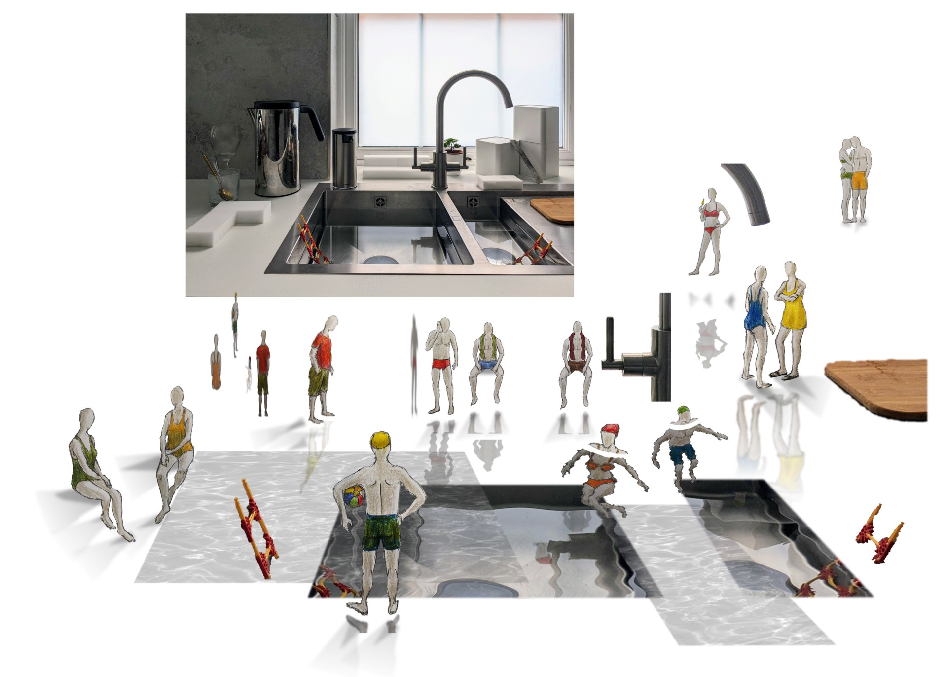 I decided to use my kitchen sink as the basis for a swimming pool scene. This gave me the opportunity to explore reflections on water, reflections on flat and curved surfaces and the distortion of objects under water.