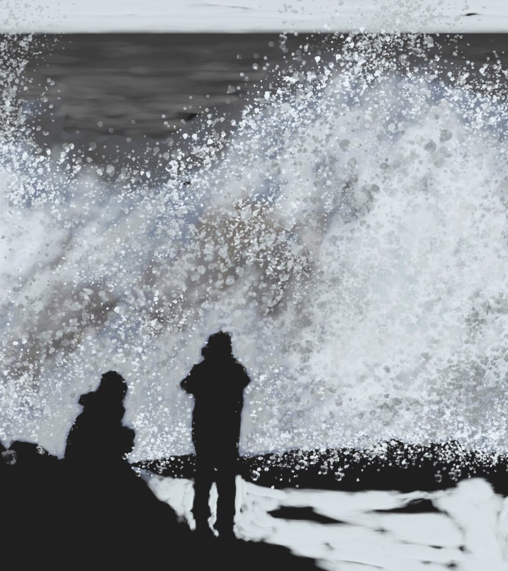 I couldn’t think of any existing sketch that would lend itself to the negative treatment but I did have a storm pic on my phone and have been wanting to do something with it for a while. I started with a dark ground and used the sea and sand in a negative space-ish way, to reveal the outlines of the figures and rocks. Much fun was had with a digital spatter-effect brush.