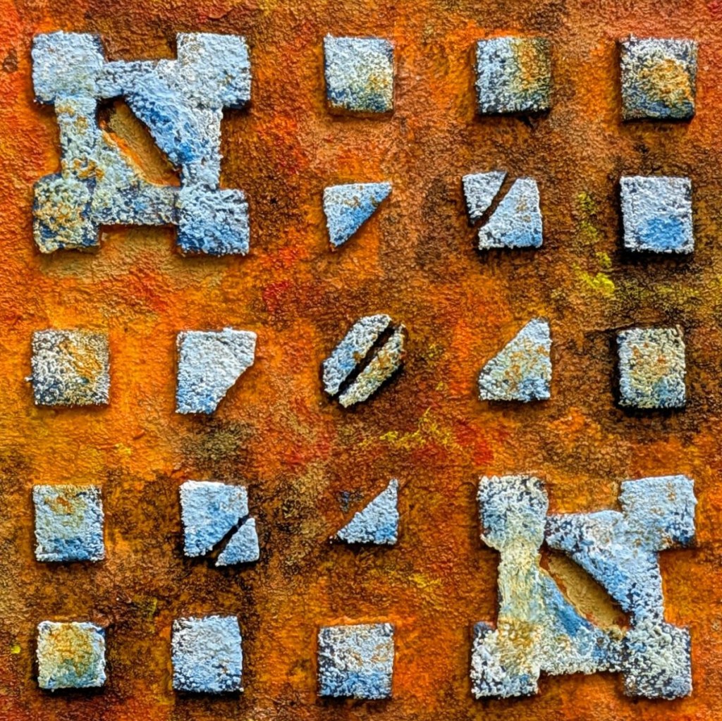 They (?) say all art is craft but not all craft is art. What is this? Lots of craft going on here – letter tiles cut down to size and hot-glued on, letter stencils and modelling paste, sand-textured gel.