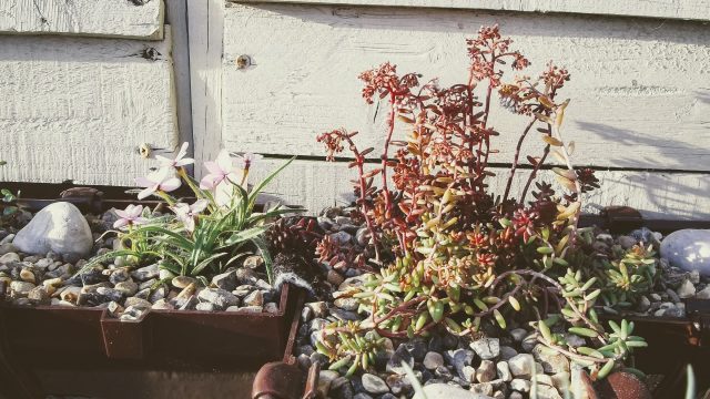 the top of the brick bbq station was looking a bit bare so I created a shallow alpine bed out of guttering …