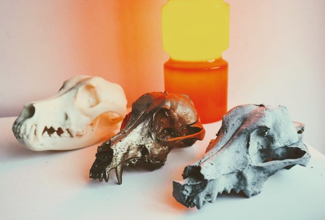 on the occasion of the death of my dog, Otto. a plastic dog skull moulded in alginate and reproduced in resin (gold waxed) and cement, with increasing amounts of mould degradation.