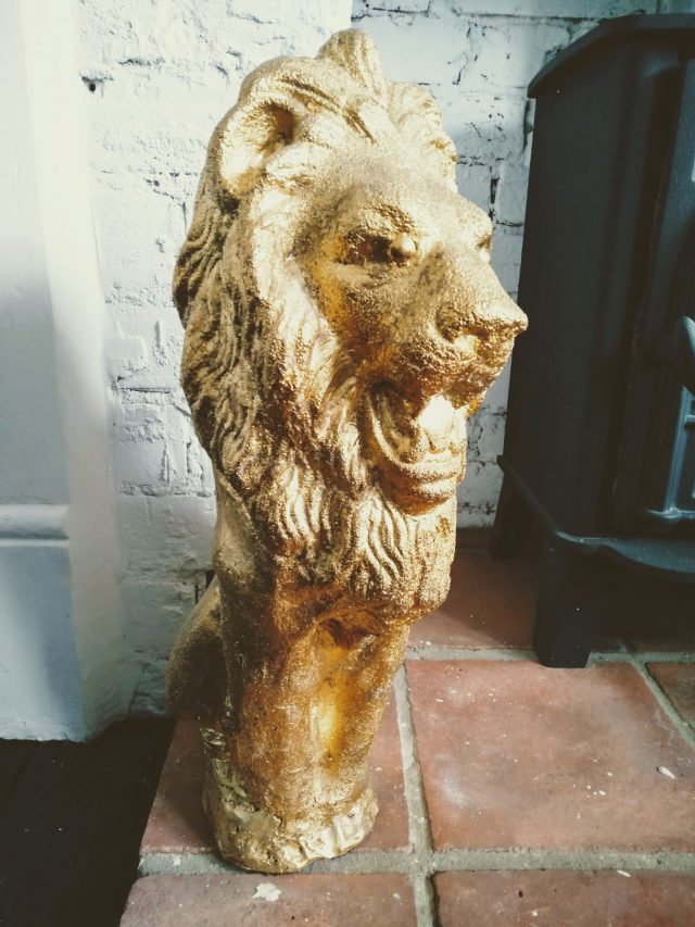 found this chap during front garden clear-out. a stone/concrete ornament. was missing his feet so gave him a fibre glass base and covered in gold leaf (of course). now proudly adorns the living room fireplace.