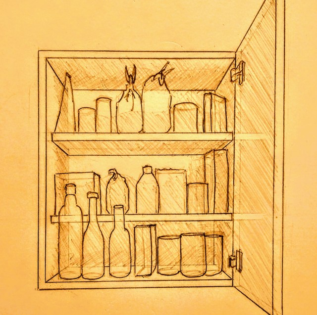 Single-point perspective with the horizon line at the bottom shelf front edge. I have given the actual visible bits a darker outline and added some shading to the cupboard itself but not the objects within.
