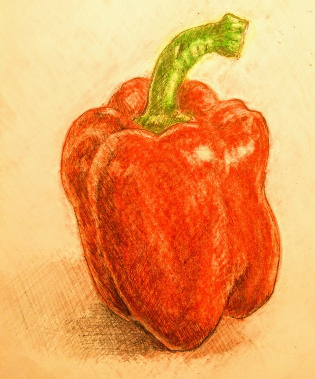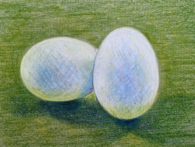 Another exercise from Experimental Drawing by Robert Kaupelis. The challenge here was to render some eggs in multiple colours but whose local colour should read as white. Coloured pencil on grey paper. The reflected green […]